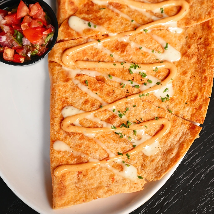 buffalo chicken, grilled sweet corn, roasted red peppers & cheddar cheese in a sundried tomato tortilla, drizzled with chipotle ranch dressing, served with sour cream & pico de gallo