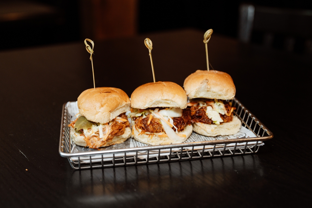 three sliders with bourbon bbq sauce, pickles & coleslaw