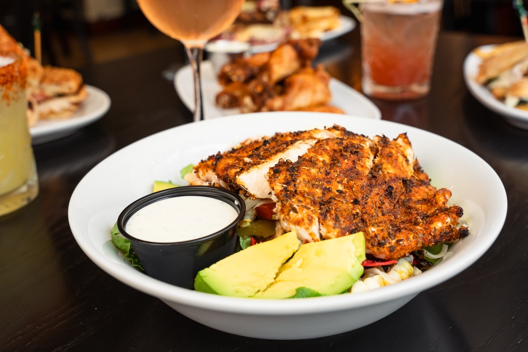 blackened chicken, romaine lettuce, avocado, grilled corn, fire-roasted salsa, tortilla chips, cheddar cheese & ranch