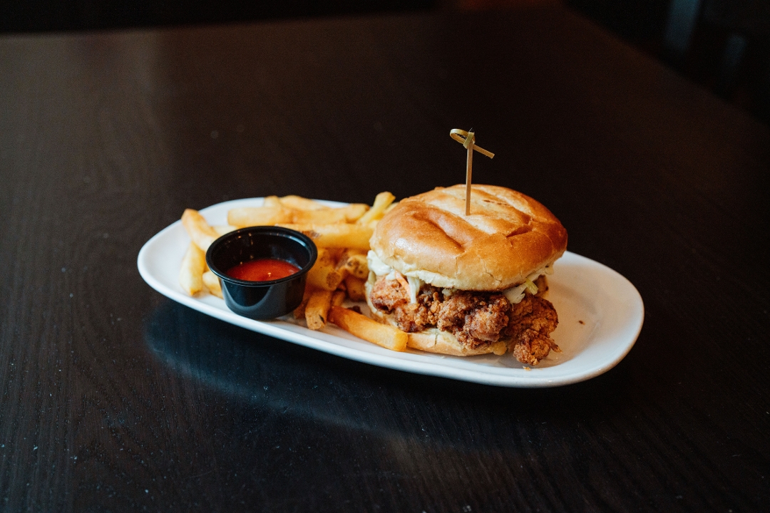 buttermilk fried chicken thigh topped with sliced pickles, coleslaw & dill pickle aioli on a toasted bun