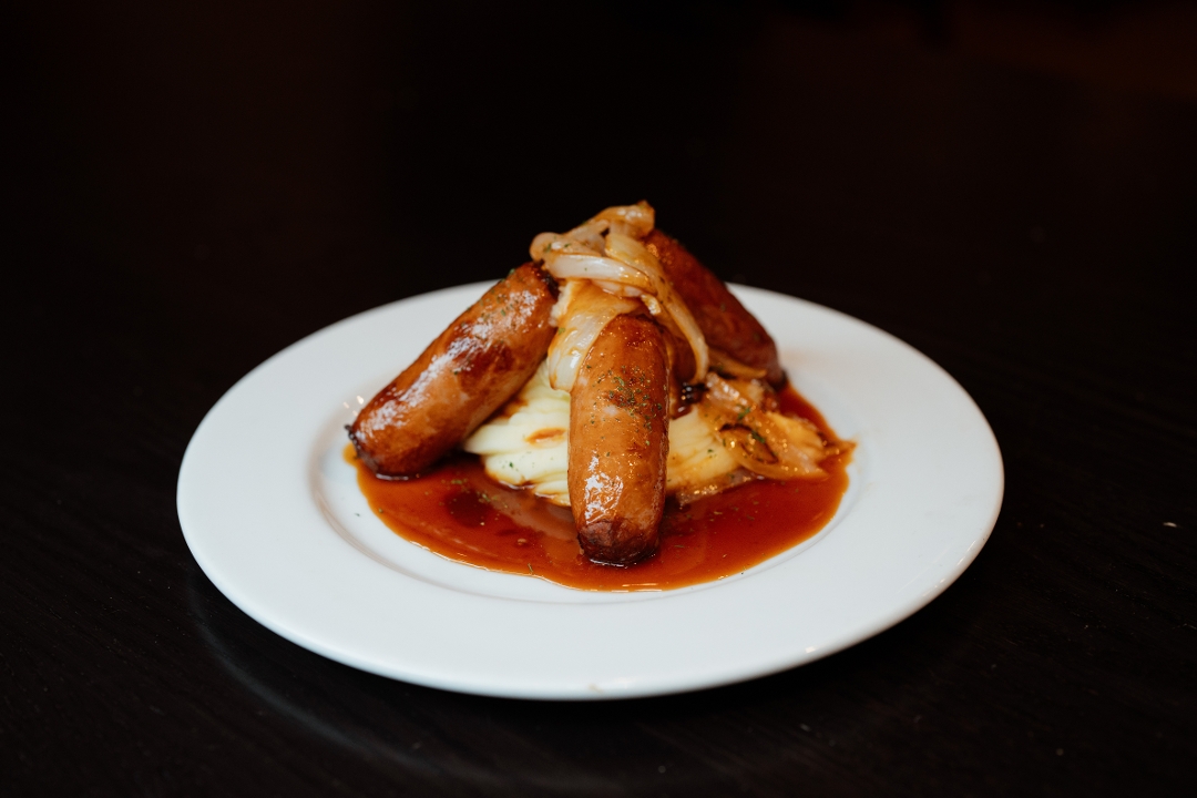 jumbo irish sausages, mashed potatoes, onions & gravy