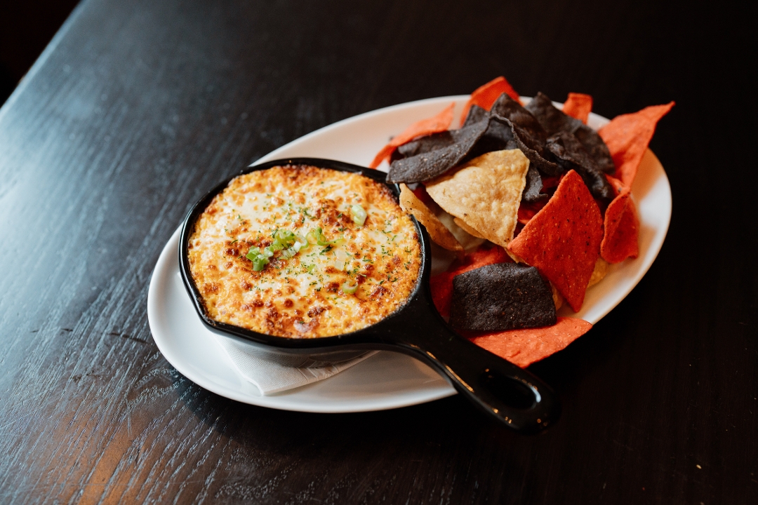 shredded chicken, buffalo sauce, ranch & cream cheese topped with mozzarella cheese then baked to perfection, served with tricolor corn tortilla chips