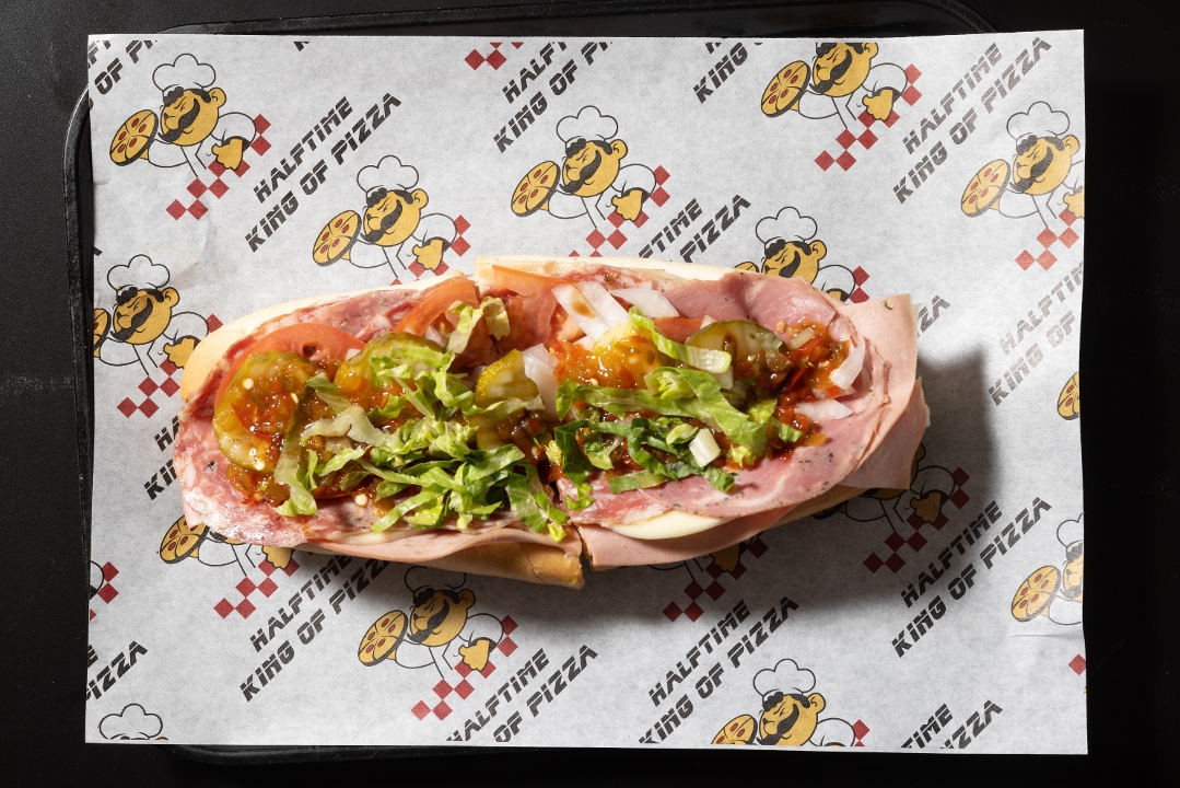 Provolone, Mortadella, Soppressata, Spicy Salami . Lettuce, Tomato, Onions, Pickles, Hots, Oil, & Vinegar